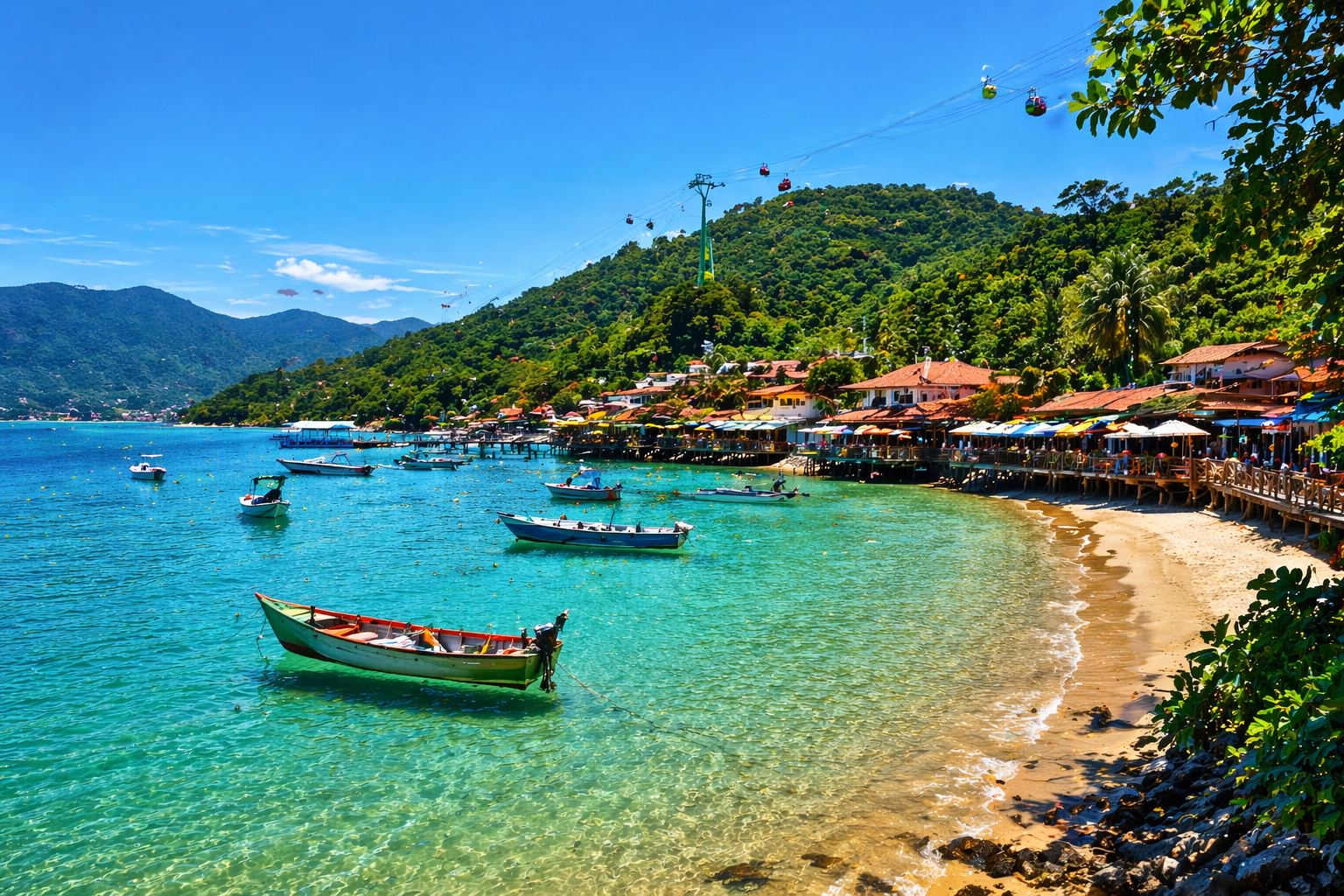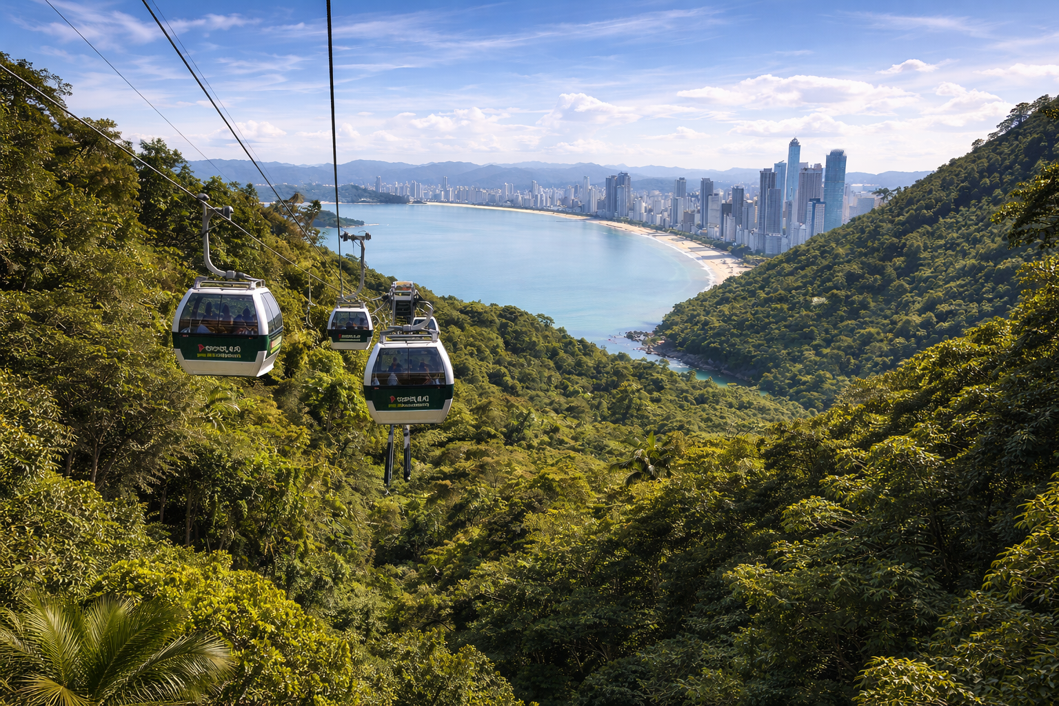 O famoso teleférico liga diferentes pontos da cidade, atravessando áreas de Mata Atlântica preservada. Durante o percurso, a vista revela uma paisagem impressionante, onde o verde intenso das montanhas encontra o azul profundo do oceano.
